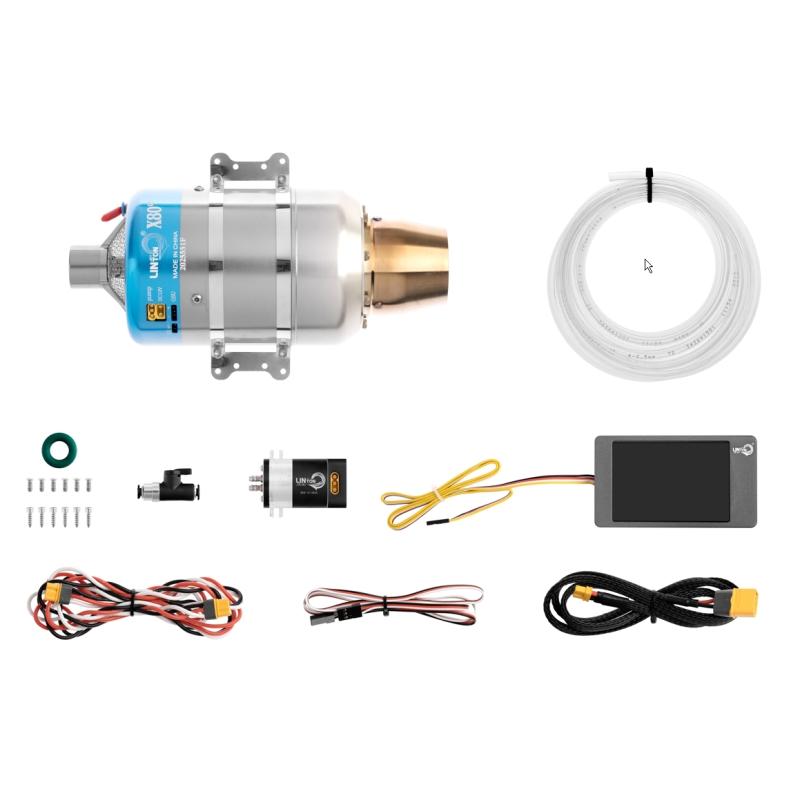 Das Triebwerk-Set enthält: Turbinen-Strahltriebwerk Linton X80-GT mit Steuereinheit, Triebwerksbefestigung, Bodenprogrammiereinheit, Kraftstoffpumpe, Befestigungsschrauben-Set, Kraftstoffleitung, Kabel-Set und Ersatzteile, Anleitung.